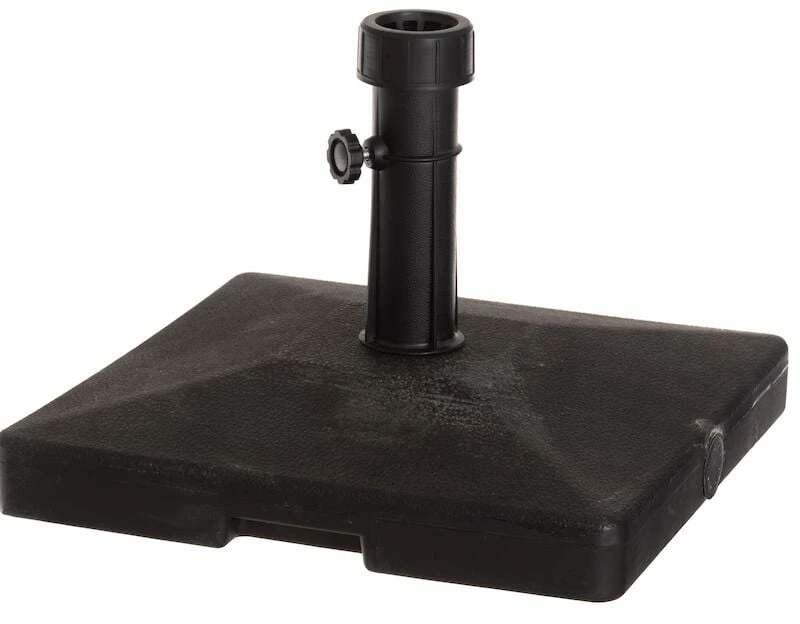 Aurinkovarjon jalka 27 kg neliön muotoinen. Musta betonista ja polyresiinista valmistettu aurinkovarjon jalka, joka pitää varjon paikallaan. Tähän jalkaan sopii halkaisijaltaan 30/35/38 mm varsi.