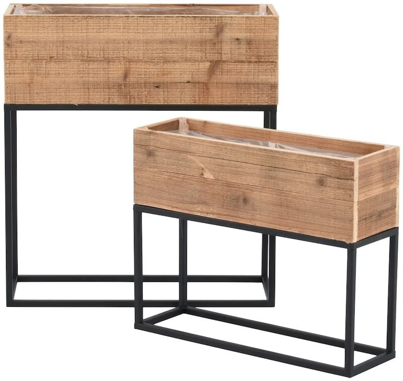 Tyylikkäät 4living Country kukkalaatikot tuovat maanläheistä tunnelmaa kotisi sisustukseen. Isompi kukkalaatikko 55x60x21 cm, pienempi 50x40x13 cm. Jalat ovat mustaksi maalattua metallia ja laatikko on kästtelemätöntä puuta. Emme suosittele kukkalaatikoita sijoitettavaksi suoraan taivasalle, katetuille terasseille ja parvekkeille kukkalaatikot soveltuvat hyvin. Ruukkua voi käyttää sisä- ja ulkotiloissa, mutta sen tulee olla talvella kuiva ja tyhjä, jotta se ei halkea. Laatikot on valmistettu kierrätyspuusta, jota on kerätty rakennuksilta, sekä käytetyistä kalusteista. Tuotteen puuosien ominaisuuksiiin kuuluu rosoinen ja epätasainen pinta.
