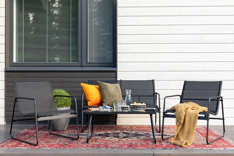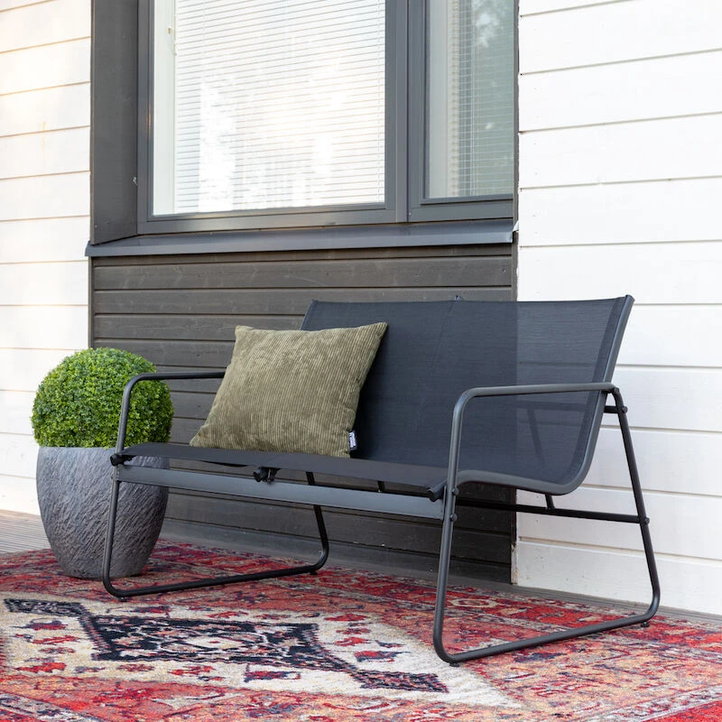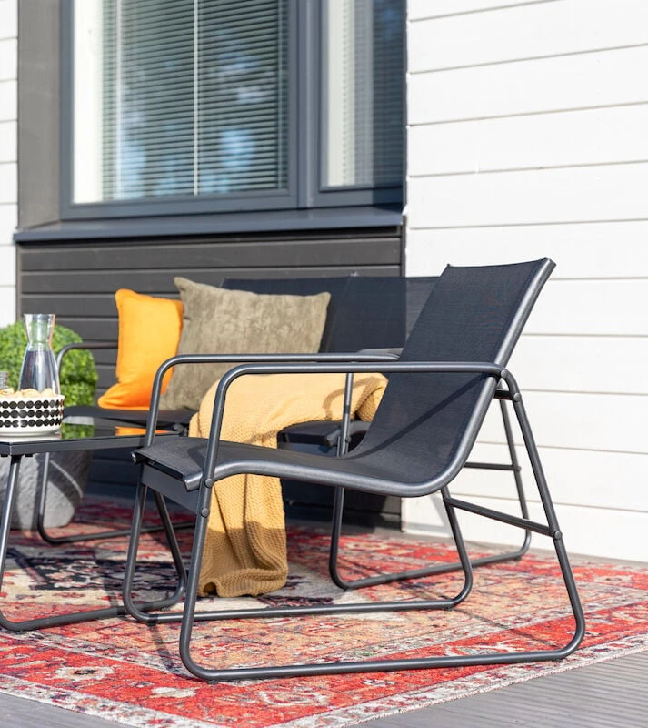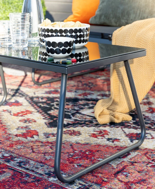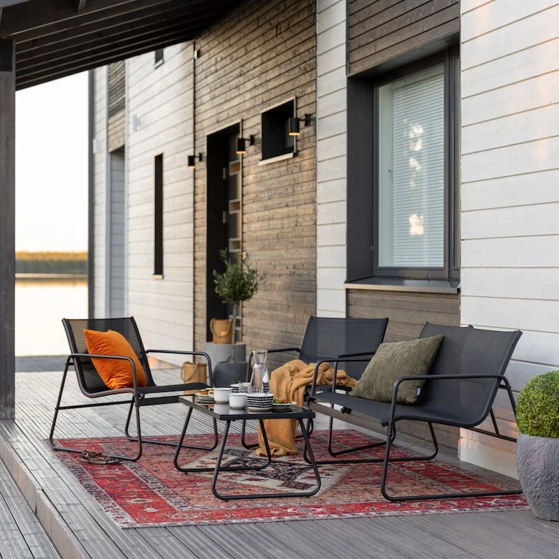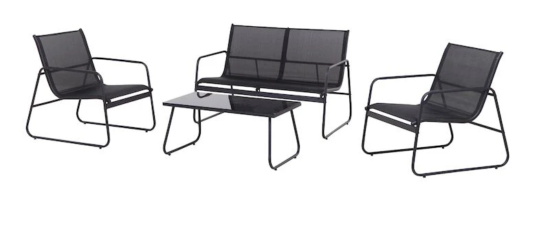 Envy Theodor sohvaryhmä sirolla ja kepeällä muotoilulla. Runkomateriaalina on metalli, istuinosa muovikangasta. Sohvapöydän päällä on 5mm lasi. Musta on ajaton ja tyylikäs värivalinta puutarhakalusteisiin. Sohvaryhmä sopii hyvin pienille terasseille.