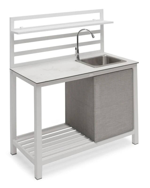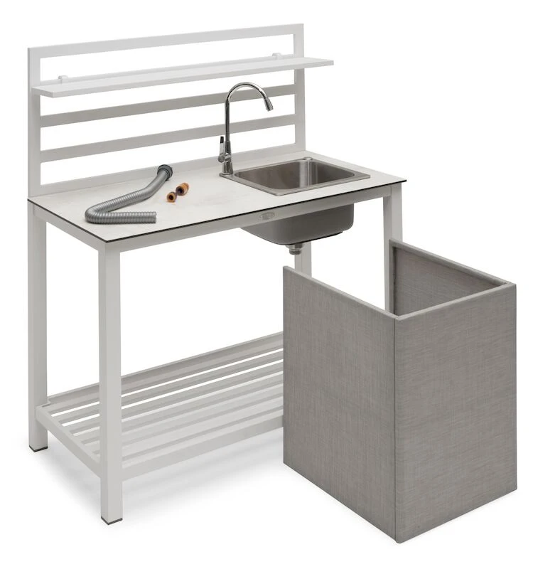 Hillerstorp Åminne kesäkeittiön avulla kokkaat kesän herkut. Kesäkeittiön materiaaleina ovat alumiini ja laminaatti. Sisältää altaan, hanan ja yhden irtonaisen hyllylevyn. Altaan alle voi sijoittaa astian, jonne vesi valuu. Astialle on tehty näkösuoja tekstile-kankaasta. Värivaihtoehtoina raikas valkoinen ja tyylikäs harmaa. Mukana liittimet puutarhaletkun kytkemiseen.