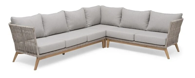 Hillerstrop Himmelsnäs on todella trendikäs ja laadukas kulmasohva Sunproof-pehmusteilla. Tässä upea ja mukava sohva kesäpäiville. Sohvan jalat on valmistettu kauniista tiikki-puusta ja istuinosa laadukkaasta polyrottinkipunoksesta, joka on kiinnitetty alumiinirunkoon. Pehmusteet ovat 100%:sta olefin-ulkokangasta, joka kestää todella hyvin säänvaihteluita ja UV-säteitä haalistumatta. Päälliset eivät ole vedenpitävät, joten tuotetta suositellaan käytettäväksi katetussa ulkotilassa tai vaihtoehtoisesti siirtämään pehmusteet sateelta suojaan.