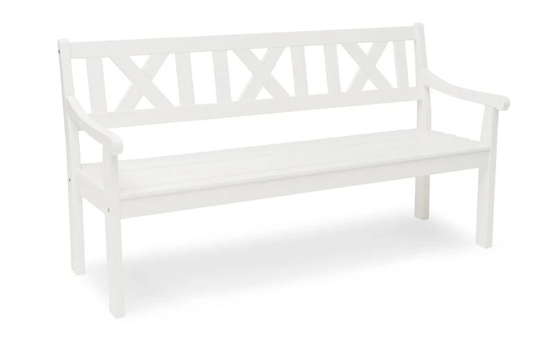 Kaunis ja ajaton Läckö puutarhapenkki. Materiaalina on FSC-merkittyä männyn sydänpuuta, joka on kuultomaalattu valkoiseksi. Penkki on tukevarakenteinen, valkoinen väri raikastaa ja antaa skandinaavisen ilmeen. Täydennä tyyli saman sarjan ruokailuryhmällä ja tuolilla.