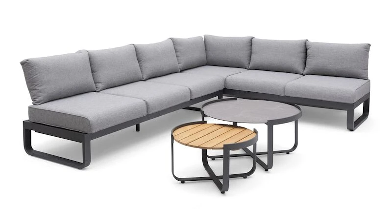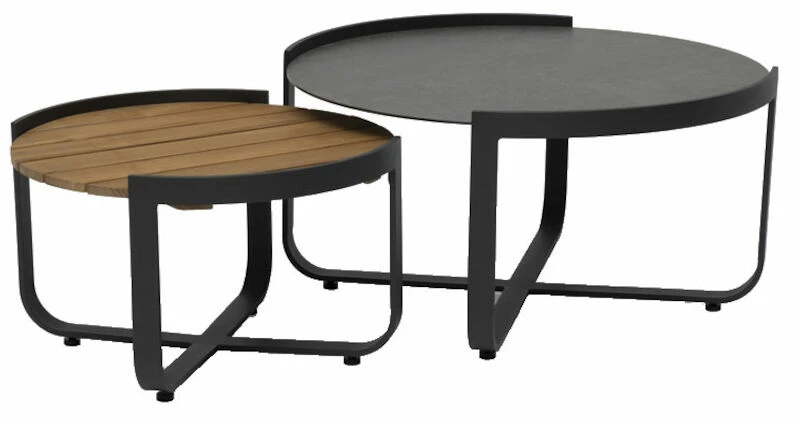 Modernit Hillerstorp Lindeby sohvapöydät. Pöytien mitat Ø81x41cm ja Ø60×35 cm. Runkomateriaali on alumiinia ja pöytälevy FSC®-sertifioitua teakkia ja laminoitua lasia. FSC® on riippumaton, kansainvälinen jäsenorganisaatio, joka edistää ympäristöystävällistä, sosiaalisesti hyödyllistä ja taloudellisesti kannattavaa maailman metsien hoitoa.