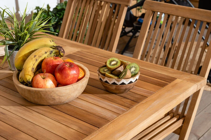 Tiikistä valmistettu House Nordic Oviedo ruokapöytä. Pöytä on taitettava, joten se menee kasalle ja vie näin ollen säilytyksessä vain vähän tilaa. Tiikki on materiaalina hyvin kestävä, se kestää erilaiset säänvaihtelut sekä kuumuuden ja lämpötilojen vaihtelun. Sävy on kauniin kullanruskea, joka tuo ulkotilojen sisustukseen kodikasta tunnelmaa. Kuvissa näkyvät tuolit eivät kuulu mukaan.