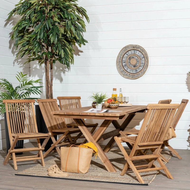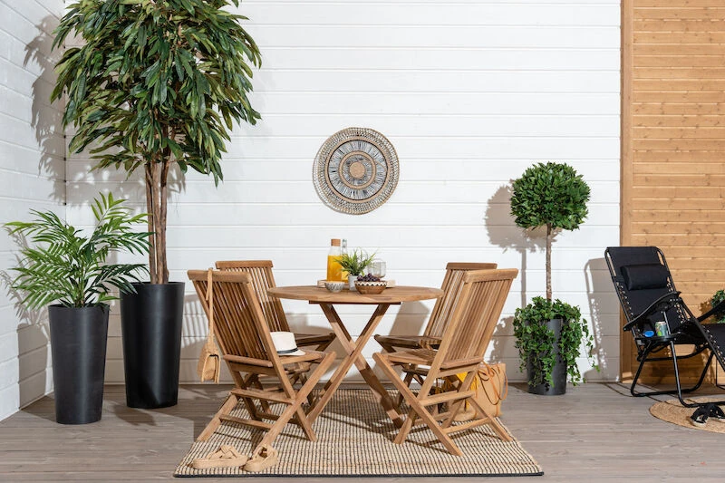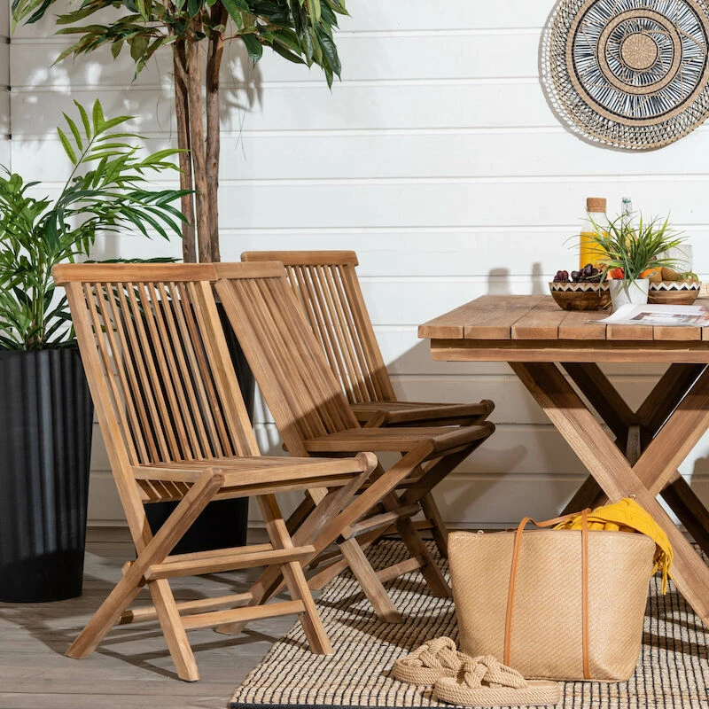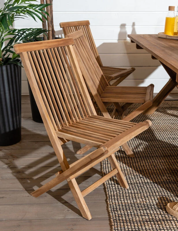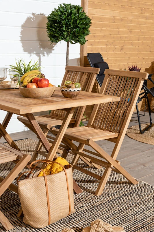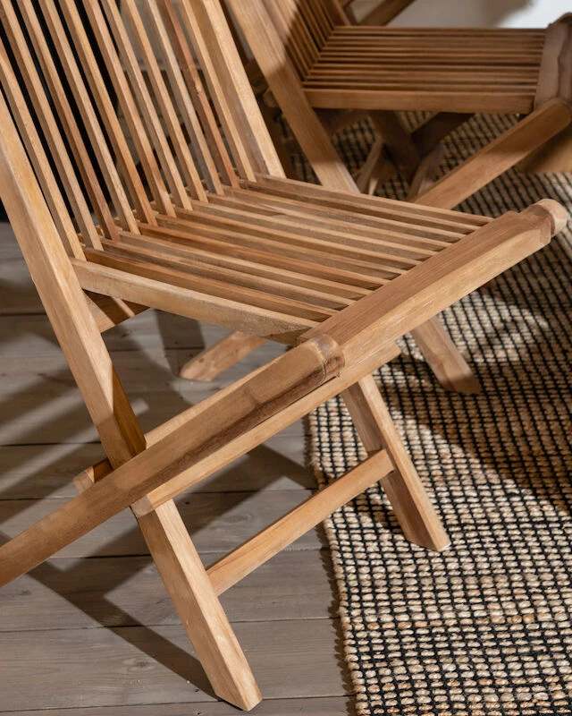 Laadukkaasta tiikkipuusta valmistettu House Nordic Toledo tiikkituoli. Tiikki on materiaalina hyvin kestävä ja se kestää erilaiset säänvaihtelut, sekä kuumuuden ja lämpötilojen vaihtelun. Tämän tuolin tiikki on peräisin Indonesiasta ja sillä on Flegt-sertifikaatti, mikä tarkoittaa, että puut on kaadettu laillisesti. Sävy on kauniin kullanruskea, joka tuo ulkotilojen sisustukseen kodikasta tunnelmaa. Sijoita tuoli ruokapöydän tuoliksi tai sivupöydän kaveriksi, jossa on mukava istuskella kahvikupposen kanssa ja nauttia kesän lämmöstä. Tuoli on taitettava, joten sitä on helppo liikutella ja se vie säilytyksessä vähemmän tilaa.