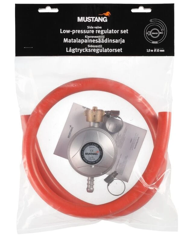 Matalapainesäädin kierreventtiilille, 29 mbar, sivuventtiilipulloon. Läpivirtaus 1,5kg/h. Letku 1 m/10 mm, -30 °C. Letkunkiristimet 2 kpl. Standardin EN16129 mukainen paineensäädin. EN16436 standardin mukainen kumiletku.