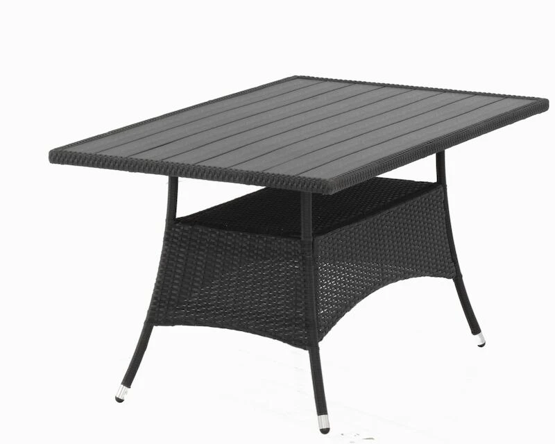 Näyttävä ja tukeva UV-suojatusta polyrottingista valmistettu pöytä ulkokäyttöön. Pöydän kansi puunsyykuvioitua erittäin kestävää ja helppohoitoista aintwood komposiittia, laudan leveys 9,5 cm.