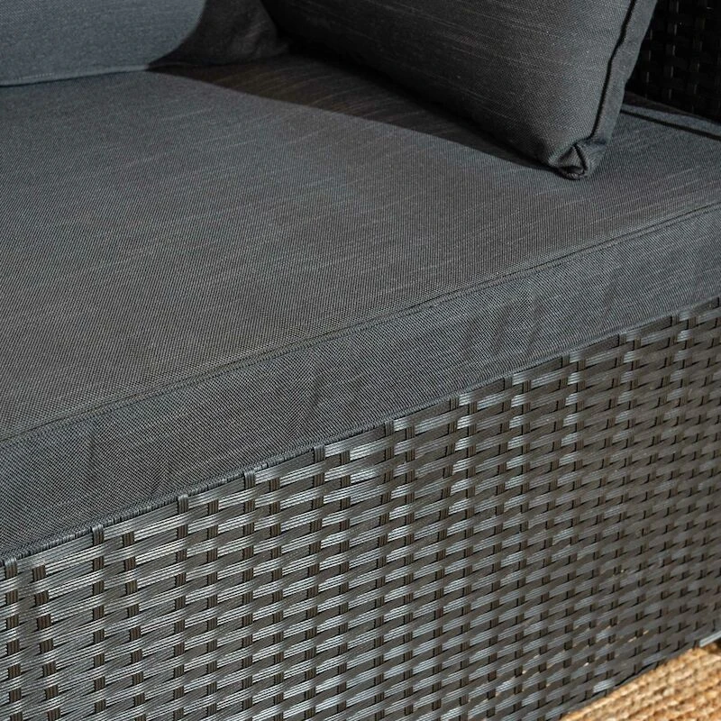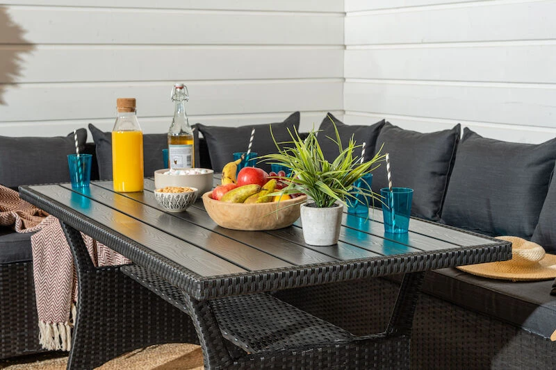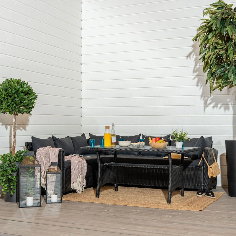 Aapa kulmasohva on täydellinen kesäillan viettoon tuttavien ja perheen kanssa. Siinä on mukava ottaa päivällä nokoset ja illan hämärtyessä kääriytyä vilttiin nauttimaan lämpimästä kesäillasta. Tuote on tukeva ja helppo pitää puhtaana. Rungossa on mustaksi pulverimaalattu teräsrunko ja pöydän kansi on aintwoodia eli puukomposiittia. Ryhmään kuuluu harmaat pehmusteet, jotka ovat irroitettavissa ja pestävissä. Verhoilu on 100% polyesteriä ja tyyny vaahtomuovia missä on seassa polyesterikuituja. Kätisyyttä voi vaihtaa.