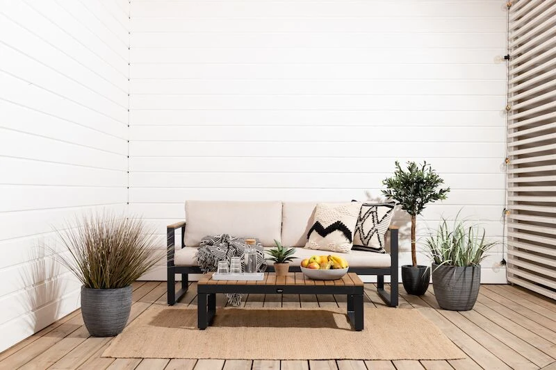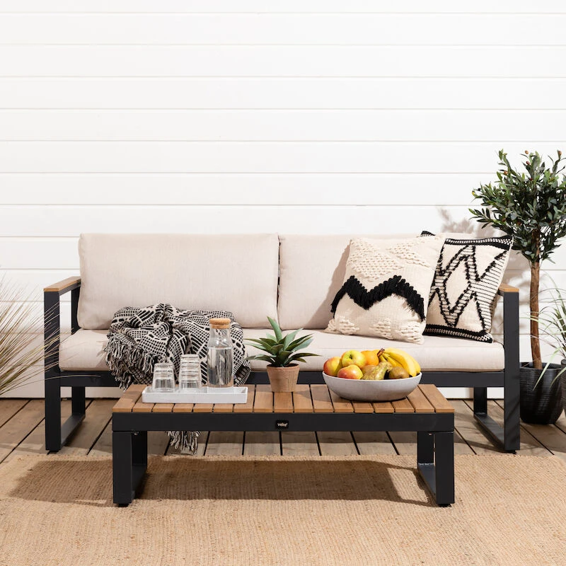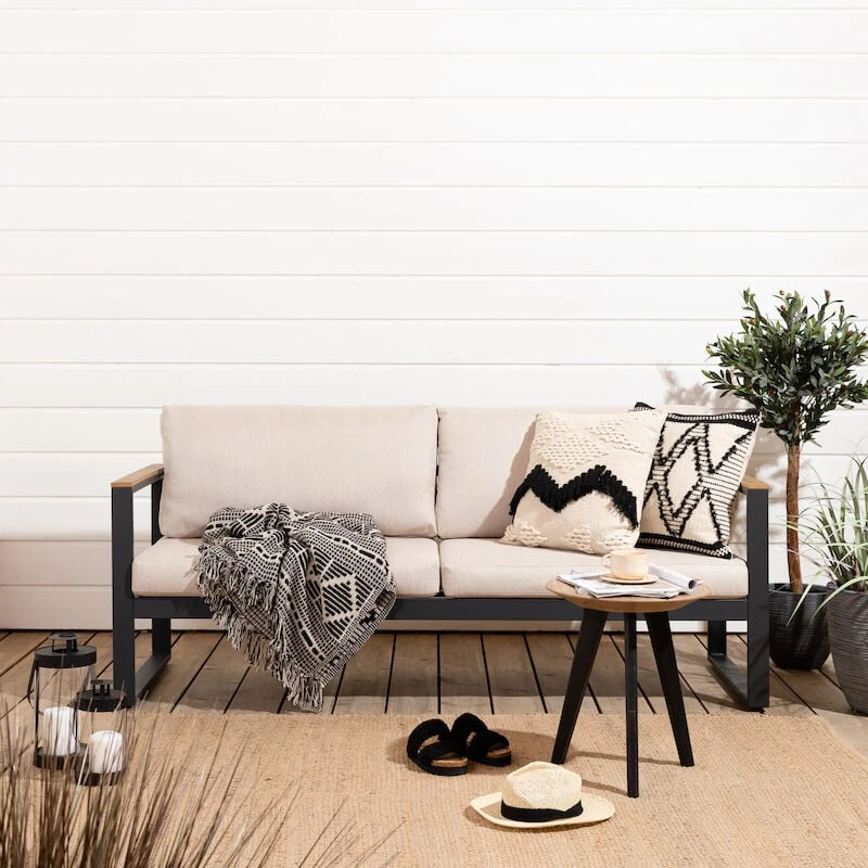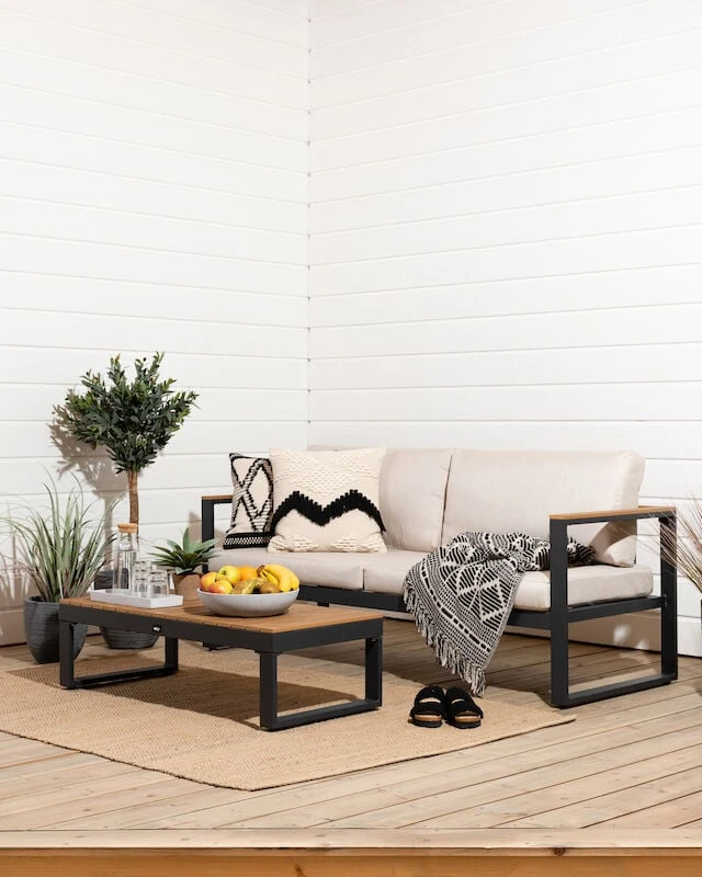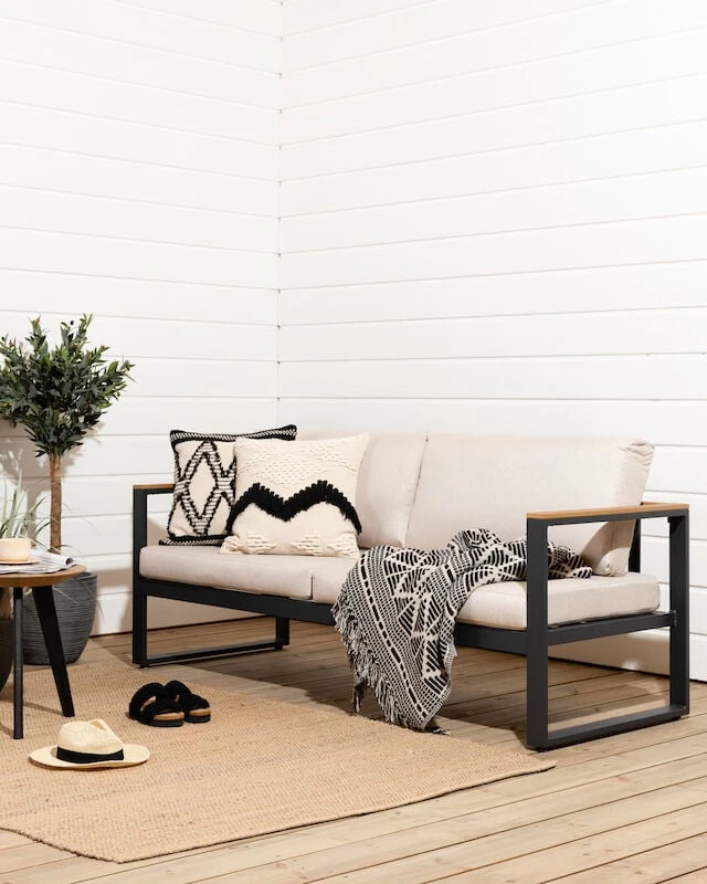 Kaunis ja selkeälinjainen Aava 3-istuttava sohva mustalla ruostumattomalla alumiinirungolla. Käsinojien päälliset on aintwoodia, joka on kovaa puristettua muovia. Mukavuutta ja pehmeyttä sohvaan tuo paksut ja puolipehmeät selkä-ja istuintyynyt. Tyynyjen kangas on vettä hylkivää 100% polyesteria. Pehmusteet tulee säilyttää sateelta suojassa.