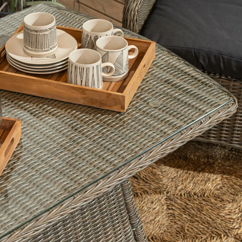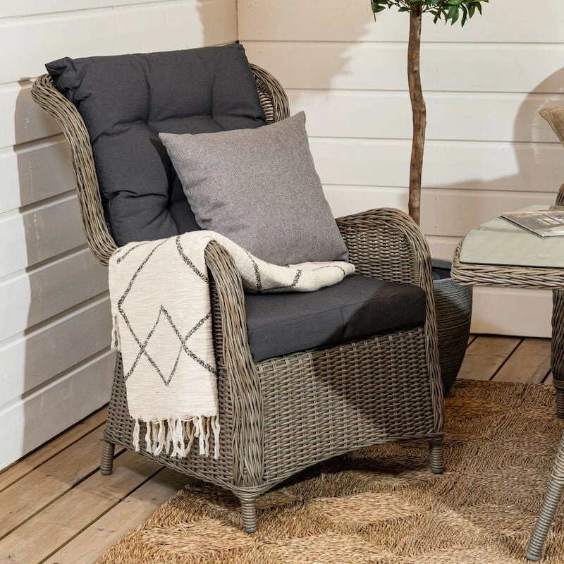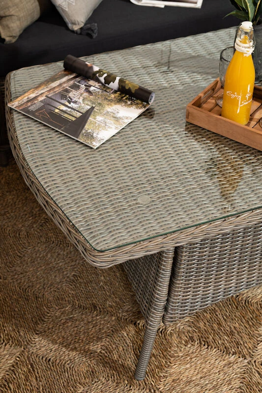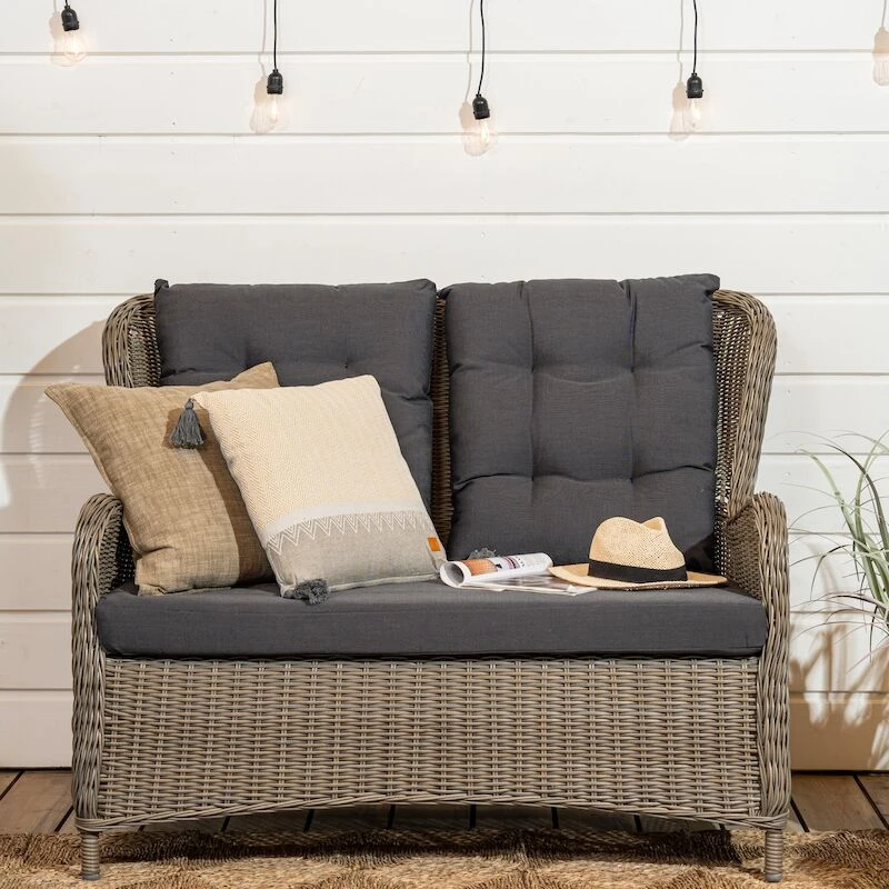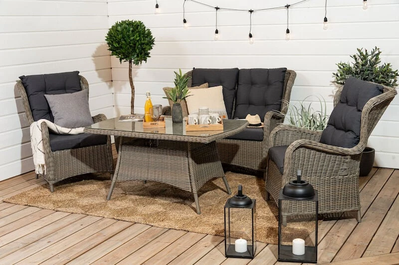 Aura sohvaryhmässä on kahden hengen sohva ja kaksi nojatuolia. Selkänojissa on poikkeuksellisen paljon korkeutta, mikä tuo ehdottomasti lisämukavuutta pidempäänkin oleskeluun. Alumiinirunko, jonka päällä pyöreää ja puolipyöreää pajua. Harmaat tyynyt ovat 100% polyesteriä, täytteenä 230gr vanu.