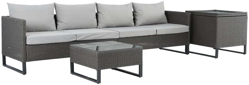 Dublin polyrottinki sohvaryhmä on monipuolinen ja helposti muutettavissa erilaiseksi kokonaisuudeksi. Sohvan moduuleilla voit rakentaa kulmasohvan lisäksi vaikka pitkän 4-hengen sohvan, tällöin sohvan leveys on 338 cm. Tähän pakettiin kuuluu myös sohvapöytä, jonka mitat ovat 61x61x36 cm. Sohvapöydän päällä oleva lasi on karkaistua lasia.
