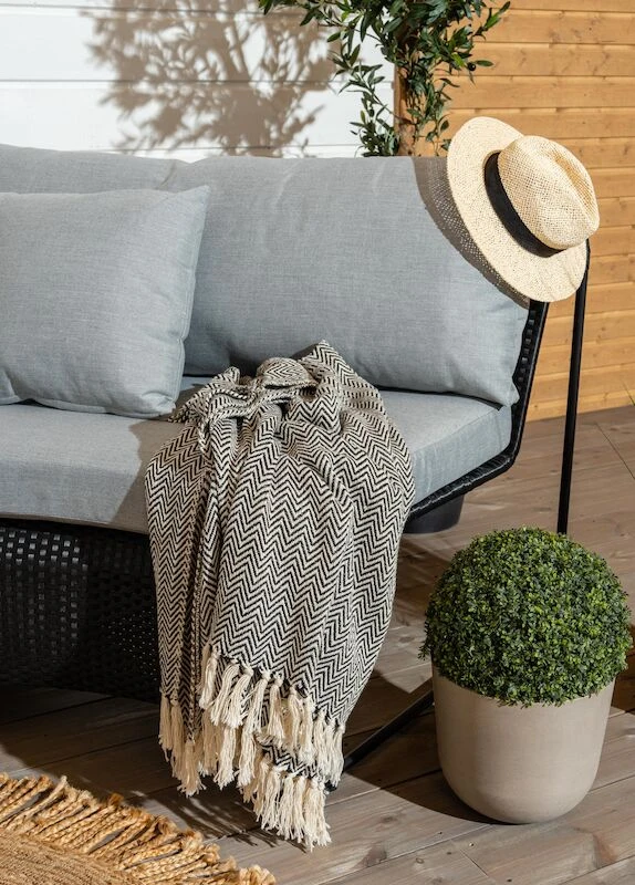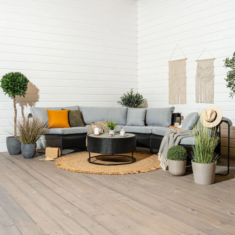 Eira sohvaryhmä on moderni kaarevan muotoinen sohvaryhmä ulkokäyttöön terassille. Runko on terästä, joka on mustaksi pulverimaalattu. Mukana tulee ihanat vaaleat pehmusteet ja pyöreä sohvapöytä. Eira sopii kotiin, jossa halutaan seurustella vieraiden kanssa kesällä ulkona ja nauttia kahvihetkistä ja miksei lounaastakin. Hanki pyöreä ulkokäyttöön sopiva juuttimatto ja pari betonijakkaraa ja saat kauniin kokonaisuuden kotiisi. Sohva on helppo kasata, osat asetetaan vierekkäin ja tyynyt päälle ja sohva on valmis käytettäväksi! Jaloissa 1 cm:n säätömahdollisuus.