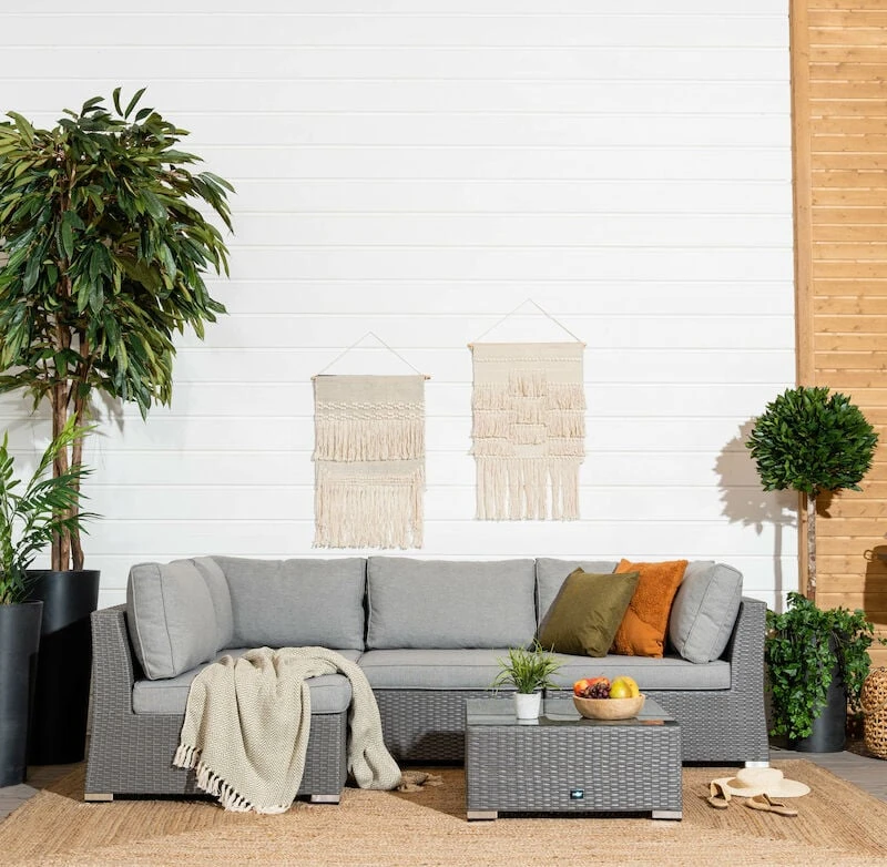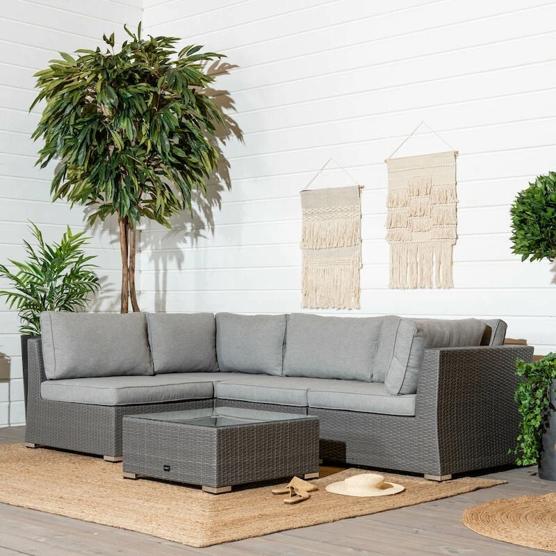 Upea avokulmasohva sohvapöydällä ja muhkeilla pehmusteilla. Tuote koostuu moduuleista, jotka kiinnitetään toisiinsa kätevillä kiinnikkeillä. Kätisyys on helposti vaihdettavissa moduulien paikkoja vaihtamalla. Moduulien paikkoja voi vapaasti vaihdella, joten tuotteesta on mahdollisuus rakentaa myös erinäköisiä kokonaisuuksia. Sohvassa on muhkeat pehmusteet, joiden päälliset on irroitettavissa ja pestävissä. Kangas on laadukas ja vettä hylkivä. Iso sohva tuo runsaasti istumatilaa ja siinä mahtuu hyvin myös makoilemaan. Ostamalla lisää moduuleja saat laajennettua tuotetta helposti. Hinta sisältää avokulmasohvan sekä