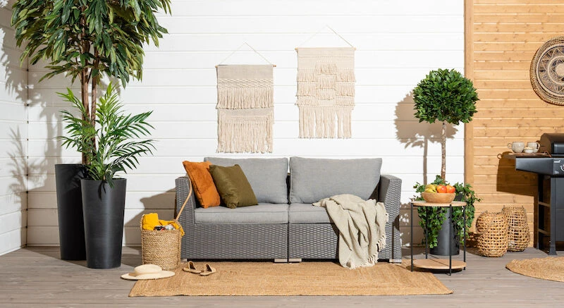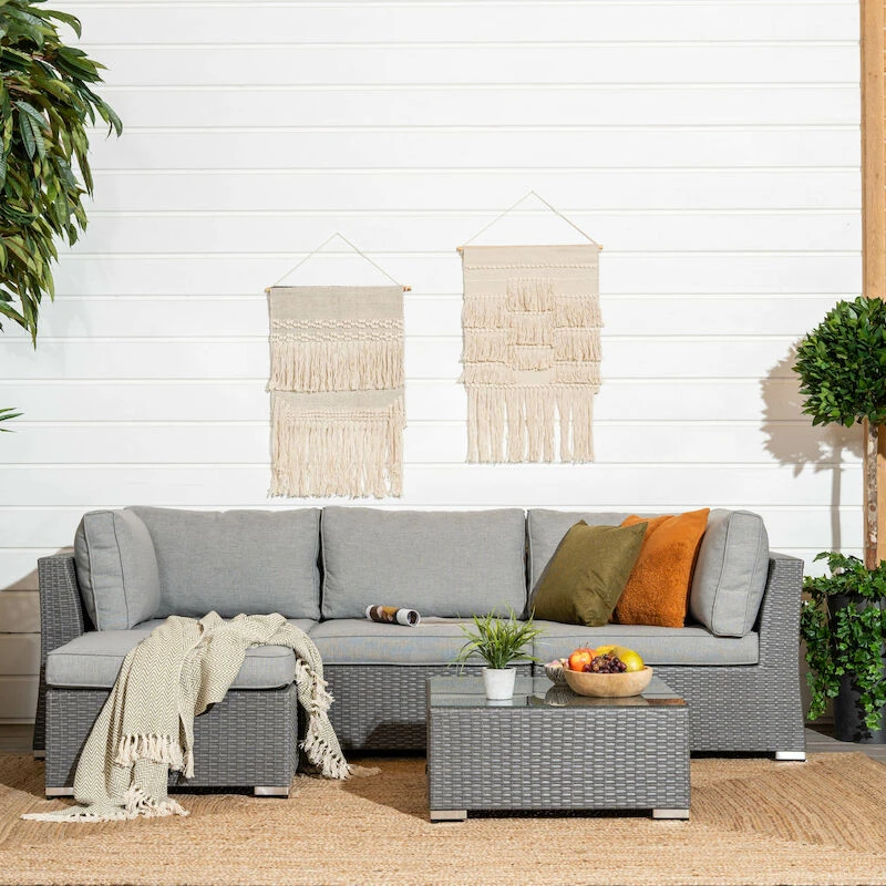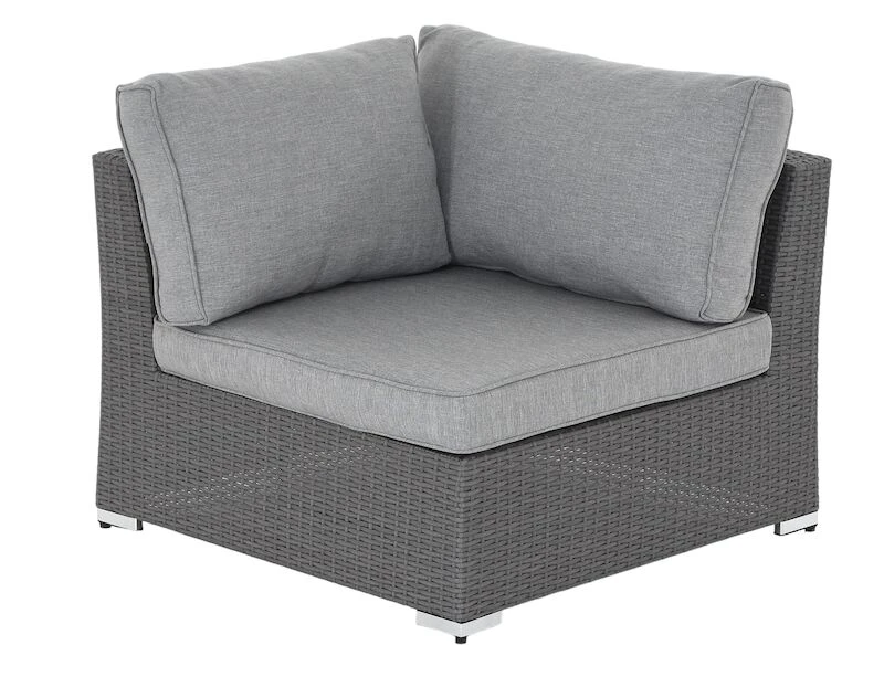 kulmamoduuli sopii käytettäväksi sellaisenaan tai yhdistämällä muiden moduulien kanssa, jolloin saat luotua haluamasi kokonaisuuden terassille. Moduulin mukana tulee kiinnikkeet, joiden avulla sen saa kiinnitettyä helposti toiseen moduuliin. Kulmamoduulissa on muhkeat pehmusteet, joiden päälliset on irroitettavissa ja pestävissä. Kangas on laadukas ja vettä hylkivä.