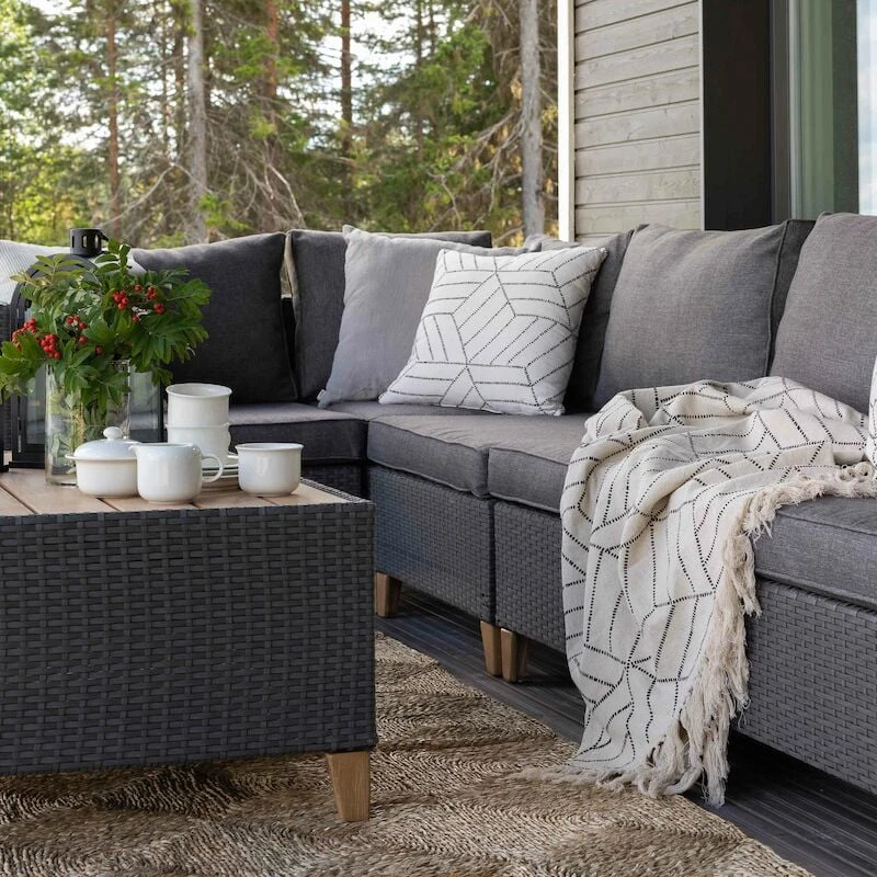 Tyylikäs Jersey sohvasetti, joka sisältää kulmasohvan ja sohvapöydän. Sohva on kasattu moduuleista, joten sohvaa on helppo muokata erilaiseksi vaihtamalla moduuleiden paikkaa. Runkomateriaalina alumiini, istuinosa on kestävää ja helppohoitoista polyrottinkipunosta. Jalat ovat maalattua alumiinia ja pöydän kansi non-woodia. Muhkeat istuintyynyt takaavat hyvän ja miellyttävän istuinmukavuuden. Sohva on kookas, joten siihen mahtuu hyvin koko perhe tai ystävät koolle viettämään kesäiltaa. Pehmusteiden päälliset ovat vettähylkivät. Pehmusteet tulee säilyttää sateelta suojassa. Tuote sopii ulkokäyttöön ja katettuun ulkotilaan. Sohvapöydän leveys 101 cm, syvyys 66 cm, korkeus 41 cm.