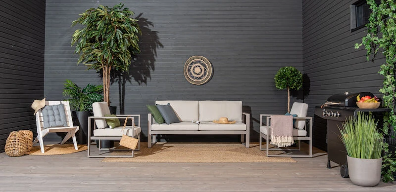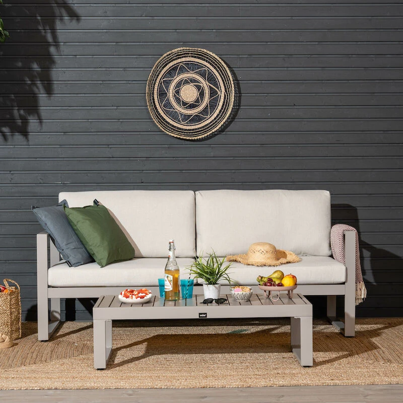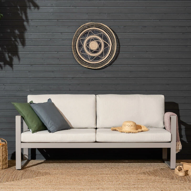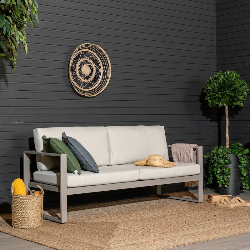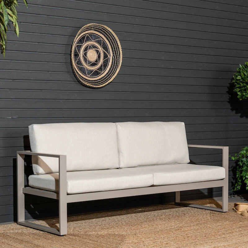 Kallas 3-istuttava sohva on täydellinen valinta terassille, patiolle tai parvekkeelle. Tämä tyylikäs sohva on suunniteltu ulkokäyttöön ja sen runko on valmistettu laadukkaasta jauhemaalatusta alumiinista, joka kestää hyvin sään vaihteluita. Sisältää muhkeat hiekan väriset istuin- ja selkäpehmusteet, joiden päälliset on irroitettavissa ja pestävissä. Pehmusteiden päälliset on verhoiltu kestävällä ulkokäyttöön tarkoitetulla vettähylkivällä polyester kankaalla.