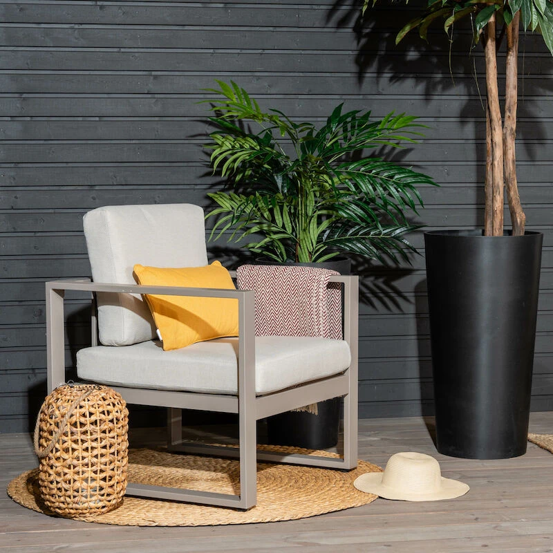 Kallas nojatuoli on täydellinen valinta terassille, patiolle tai parvekkeelle. Tämä tyylikäs nojatuoli on suunniteltu ulkokäyttöön ja sen runko on valmistettu laadukkaasta jauhemaalatusta alumiinista, joka kestää hyvin sään vaihteluita. Sisältää muhkeat hiekan väriset istuin- ja selkäpehmusteet, joiden päälliset on irroitettavissa ja pestävissä. Pehmusteiden päälliset on verhoiltu kestävällä ulkokäyttöön tarkoitetulla vettähylkivällä polyester kankaalla.