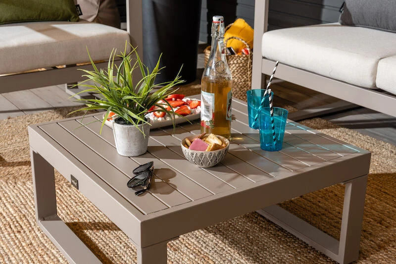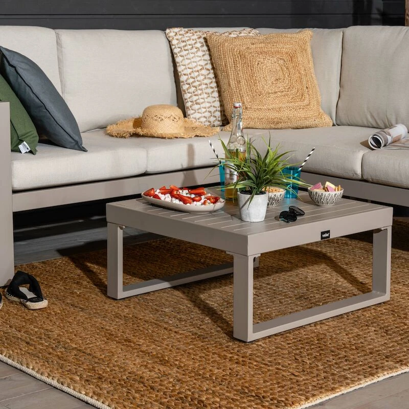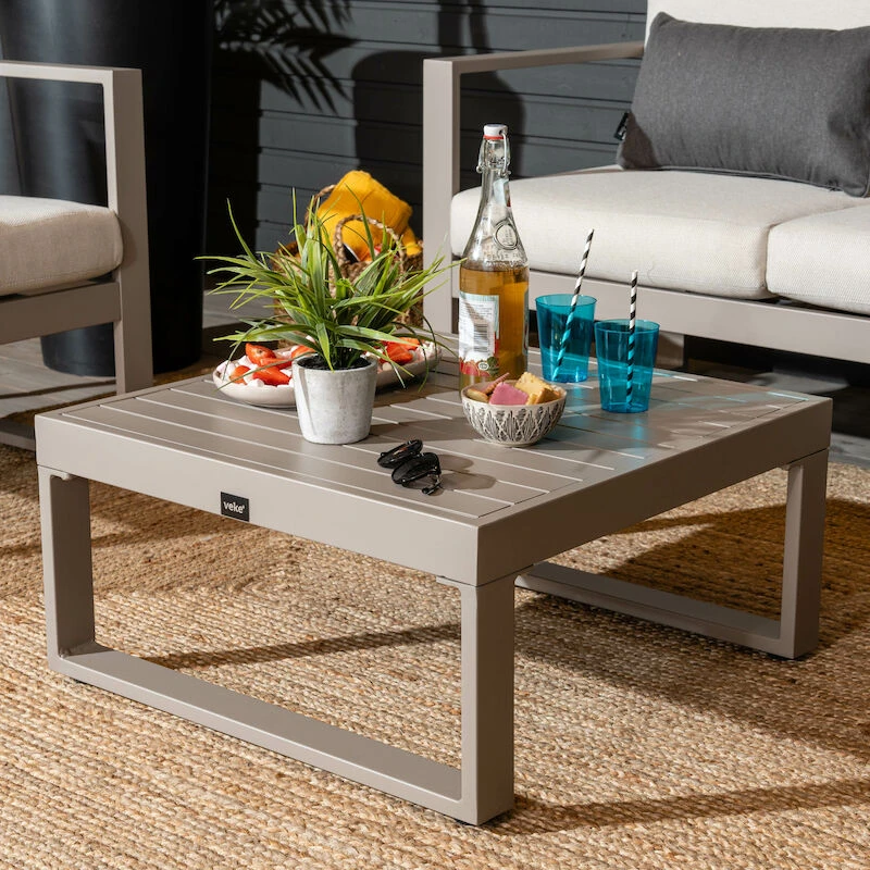 Nauti auringosta ja kesäilloista Kallas-sohvapöydän äärellä! Sohvapöytä on suunniteltu ulkokäyttöön ja sen runko on valmistettu laadukkaasta jauhemaalatusta alumiinista, joka kestää hyvin sään vaihteluita. Tämä ulkokäyttöön sopiva sohvapöytä on täydellinen lisä -tuotesarjan muiden tuotteiden kanssa. Sohvapöytä tuo yhtenäisyyttä ja tyylikkyyttä ulkotilaasi. Lisäksi se tarjoaa mukavasti tilaa juomille, kirjoille ja pikkupurtaville, joten voit rentoutua ja nauttia vapaapäivästäsi täysin siemauksin. Kestävä alumiinirakenne takaa pitkän käyttöiän ja helpon huollettavuuden.