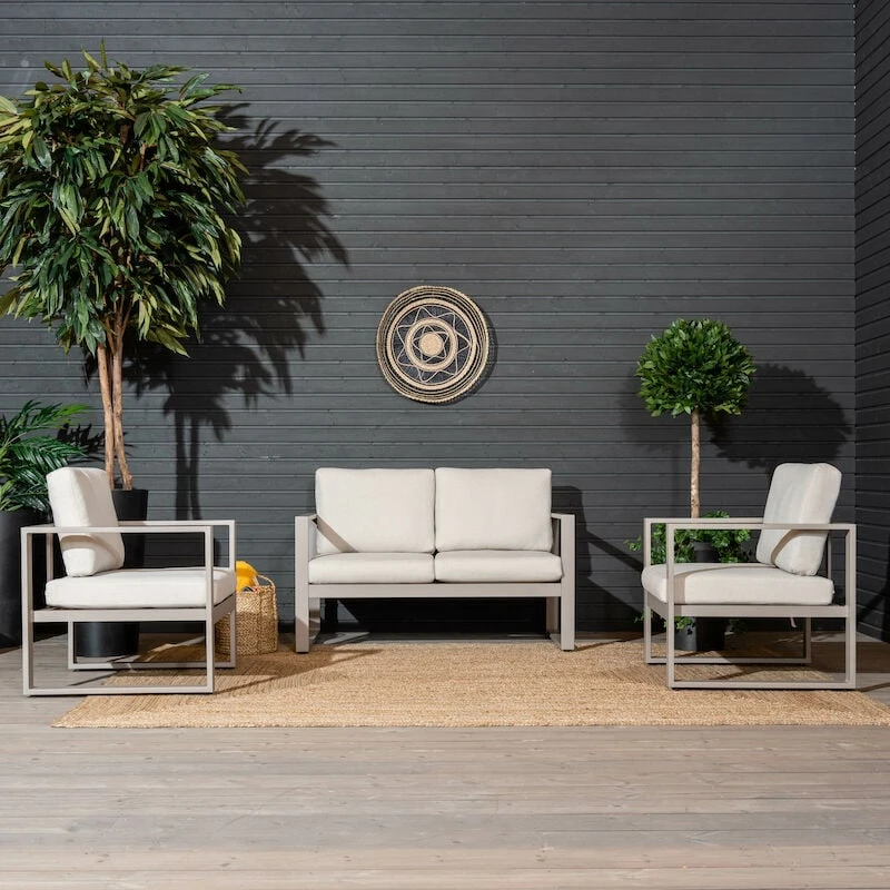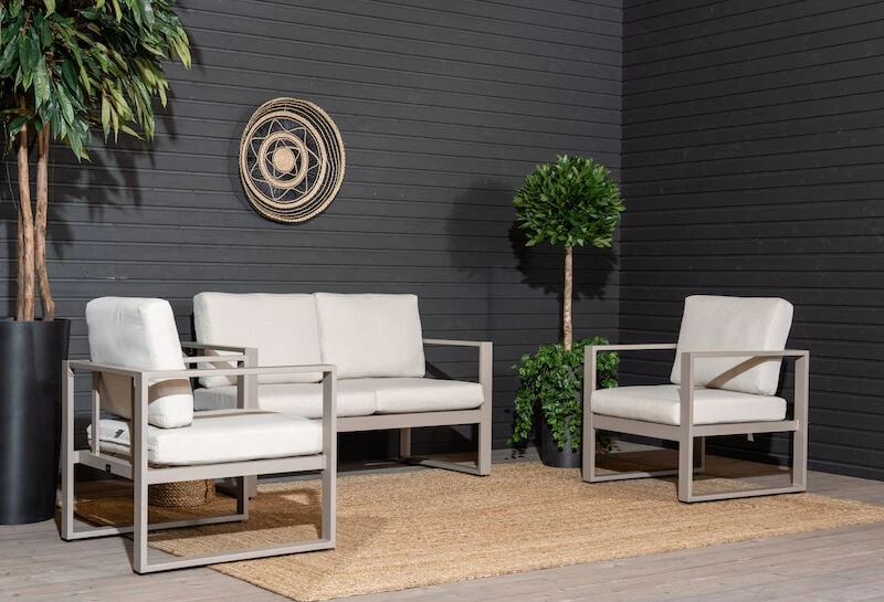 Kallas sohvaryhmä on erinomainen valinta terassille, patiolle tai parvekkeelle. Tämä tyylikäs sohvaryhmä on suunniteltu ulkokäyttöön ja sen runko on valmistettu laadukkaasta jauhemaalatusta alumiinista, joka kestää hyvin sään vaihteluita. Sisältää 2-istuttavan sohvan, kaksi nojatuolia sekä muhkeat hiekan väriset istuin- ja selkäpehmusteet, joiden päälliset on irroitettavissa ja pestävissä. Pehmusteiden päälliset on verhoiltu kestävällä ulkokäyttöön tarkoitetulla vettähylkivällä polyester kankaalla. Hinta ei sisällä sohvapöytää.