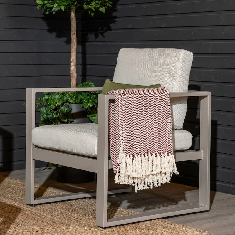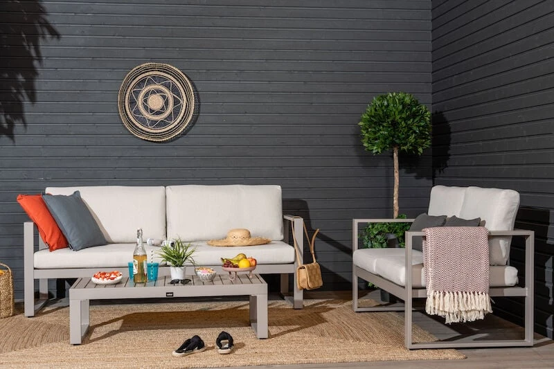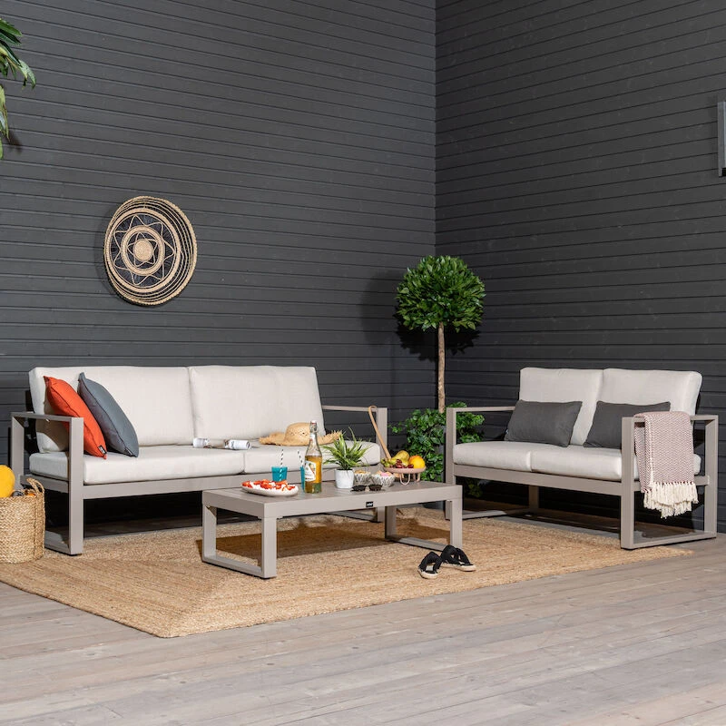 Kallas sohvaryhmä on erinomainen valinta terassille, patiolle tai parvekkeelle. Tämä tyylikäs sohvaryhmä on suunniteltu ulkokäyttöön ja sen runko on valmistettu laadukkaasta jauhemaalatusta alumiinista, joka kestää hyvin sään vaihteluita. Sisältää 3-istuttavan sohvan, 2-istuttavan sohvan, sohvapöydän sekä muhkeat hiekan väriset istuin- ja selkäpehmusteet, joiden päälliset on irroitettavissa ja pestävissä. Pehmusteiden päälliset on verhoiltu kestävällä ulkokäyttöön tarkoitetulla vettähylkivällä polyester kankaalla.