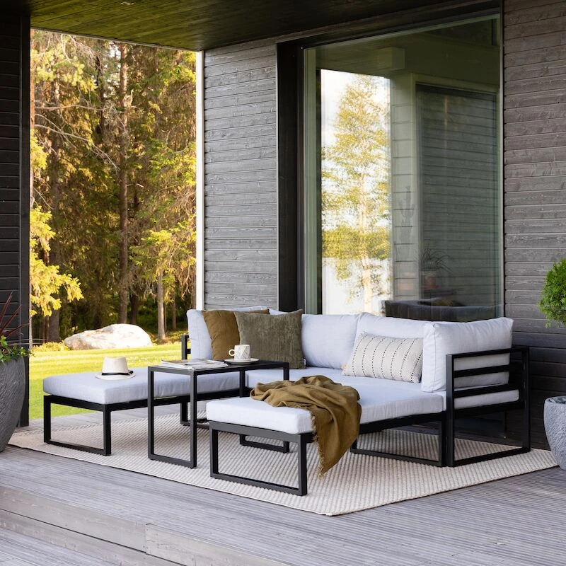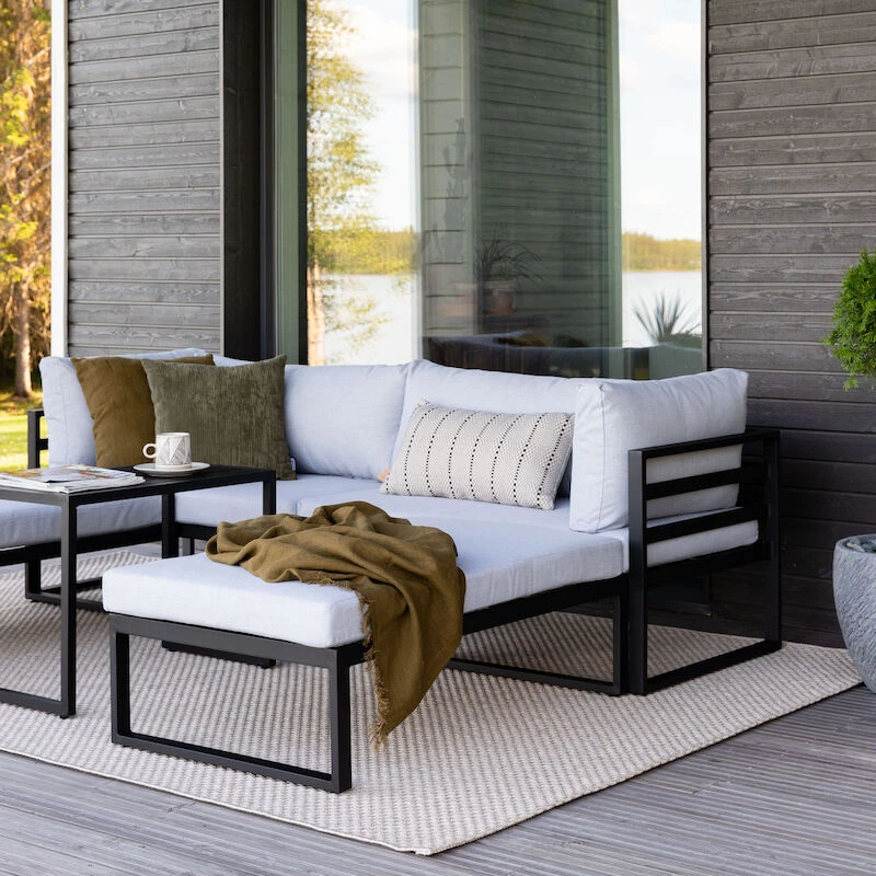 Kallio sohvaryhmä on yksinkertaisen tyylikäs ja kaunis, todella viehättävä ulkosohvaryhmä. Tämän sohvaryhmän kehtaa laittaa niin terassille, kuin vaikka paviljongille. Ryhmän käyttömahdollisuudet ovat monipuoliset sillä kulmapalat, rahit ja pöytä ovat liikuteltavissa. Sohvaryhmän tyynyjen päälliset ovat 100% polyesteriä, ne ovat irrotettavissa ja pestävissä. Runko on jauhemaalattua alumiinia, joten ryhmää on helppo siirrellä sen keveyden vuoksi. Tuote toimitetaan muutoin valmiiksi kasattuna, mutta se täytyy toki asetella ja laittaa tyynyt paikoilleen. Kuvassa näkyvässä asetelmassa divaanin istuinsyvyys on 150 cm. Rahin mitat 65×106 cm.