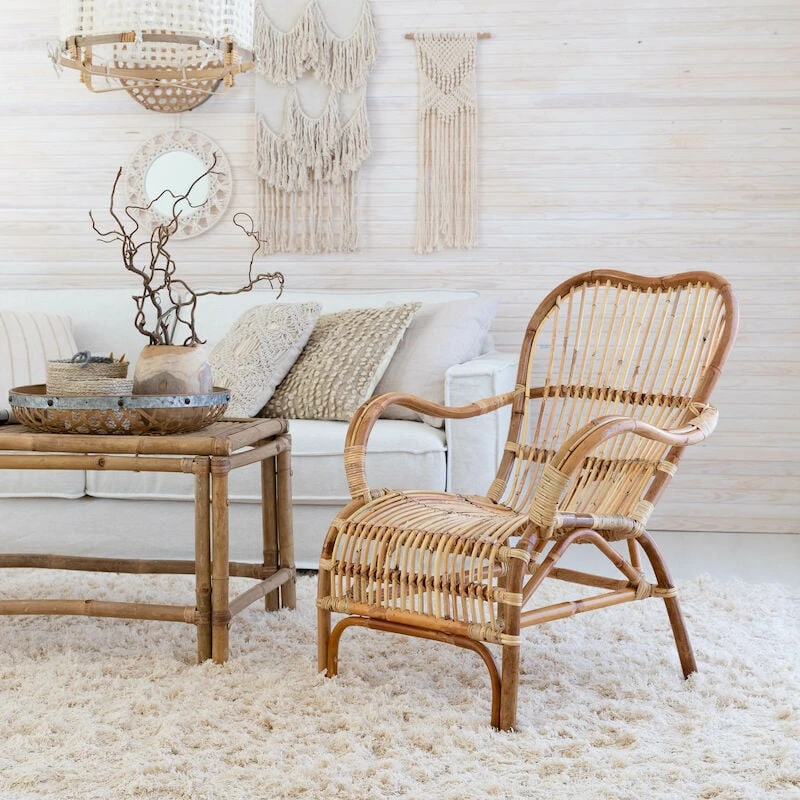 Ajaton ja tyylikäs muotoilu yhdistyy tässä ihanassa rottinkituolissa. Tuoli on valmistettu aidosta rottingista. Rottinki on ekologinen luonnonmateriaali ja sen ominaisuuksiin kuuluu värivaihtelut ja tummemmat kohdat. Värivaihtelut, epätasaisuudet ja käsityön jälki tekevät jokaisesta rottinkituotteesta yksilöllisen. Rottinki patinoituu ajan saatossa. Pehmeyttä tuoliin saa esimerkiksi lampaantaljalla tai viltillä.