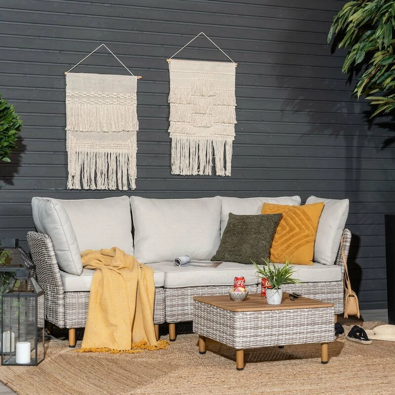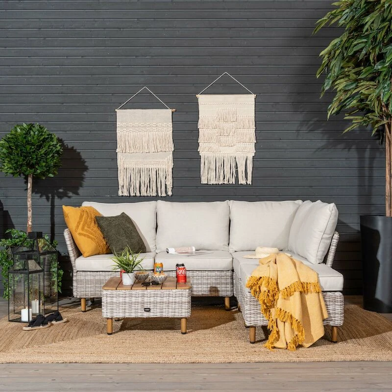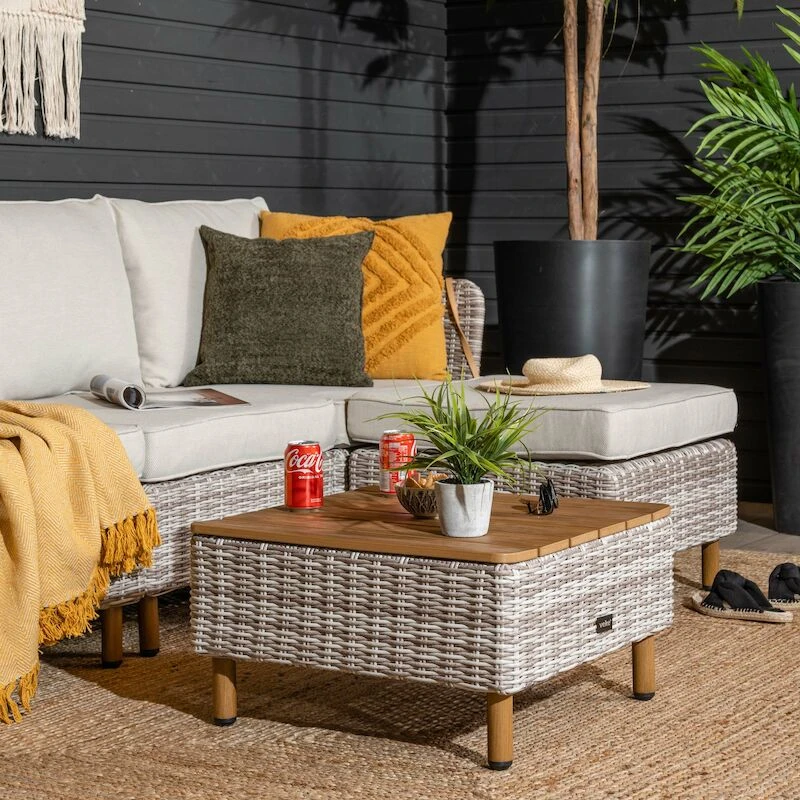 Tyylikäs ja helppohoitoinen sohvapöytä kuuluu monipuoliseen . Pöydän runko on alumiinia, punos UV-suojattua polyrottinkia ja kansi sekä jalat huoltovapaata polywoodia.