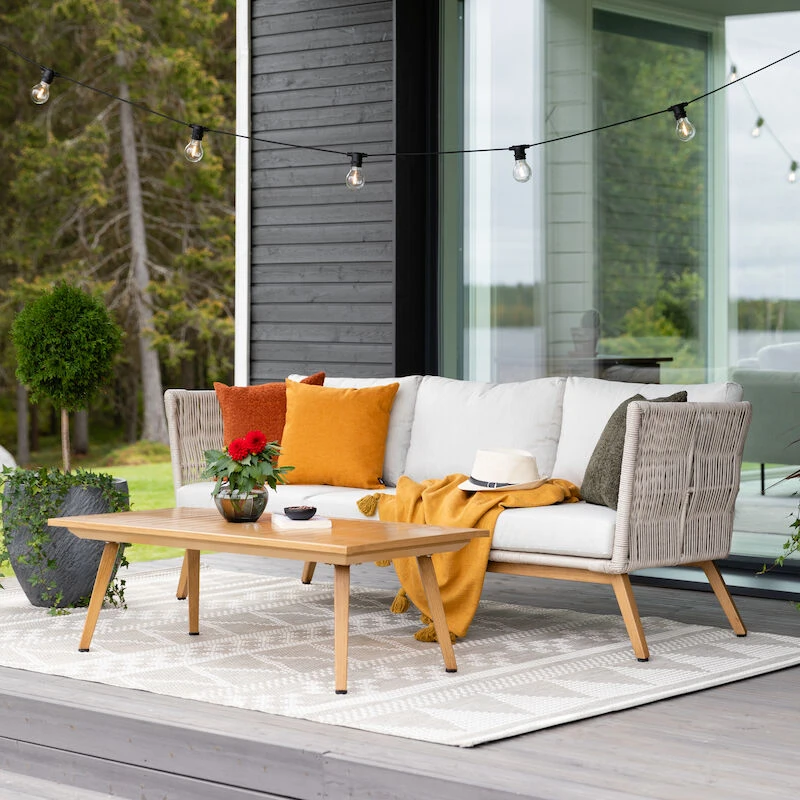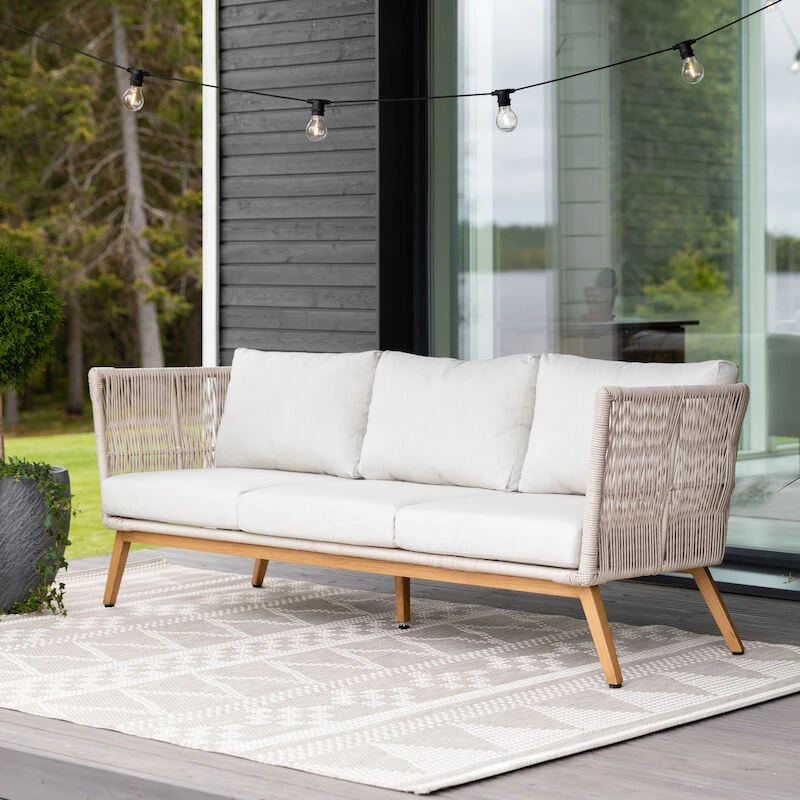 Loiste on kaunis 3-istuttava polyrottinkinen sohva hiekan värisillä pehmusteilla. Tyylikäs kokonaisuus syntyy kauniin värisen punoksen, muhkeiden pehmusteiden ja siron jalkaosan yhdistelmästä. Sohvan runko ja jalkaosa ovat kestävää alumiinia, jossa on puukuviota jäljittelevä maalipinta. Sohva on miellyttävä, mutta jämäkkä istua. Pehmusteiden päälliset ovat säänkestävää kangasta, päälliset ovat irroitettavat. Pehmusteet eivät kuitenkaan ole vedenpitävät, joten ne tulee suojata sateelta.