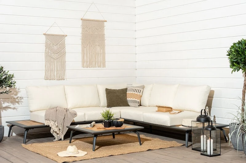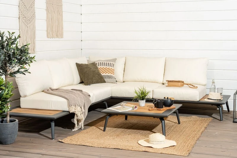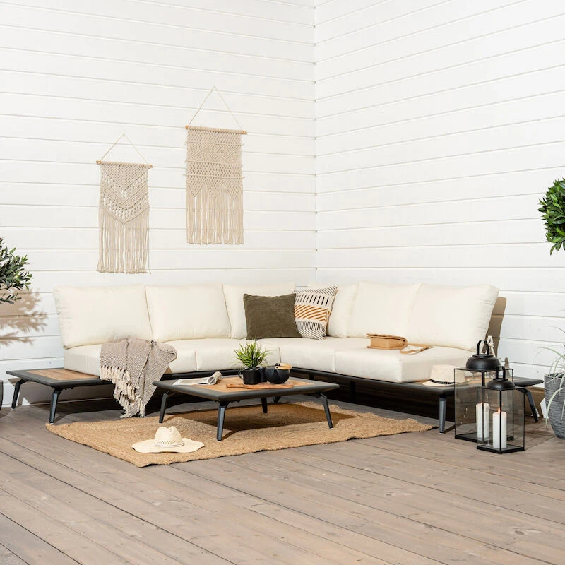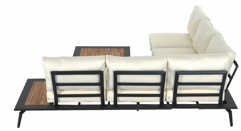 Savu sohvaryhmään kuuluu puutarhasohva ja sohvapöytä. Isokokoinen kulmasohva tuo puutarhaan tai terassille kaivattua oleskelutilaa. Kulmasohvan päädyissä on myös laskutilaa esim. viilentäville virvokkeille. Puuosat ovat tiikkiä ja runko alumiinia. Savu ryhmässä on ihanat muhkeat vaalean hiekan väriset pehmusteet, jotka kannattaa siirtää sateen suojaan. Pehmusteiden päällinen on polyesteriä ja niissä on 15 cm paksu vaahtomuovi sisällä. Sohvan runko on kaunista suunnittelua ja ryhmä onkin todella tyylikkään näköinen myös taustalta. Sohvaryhmä toimitetaan osissa, mutta on helppo kasata. Kasauksessa täytyy asentaa jalat ja selkänojat paikalleen ja totta kai kauniit pehmusteet.