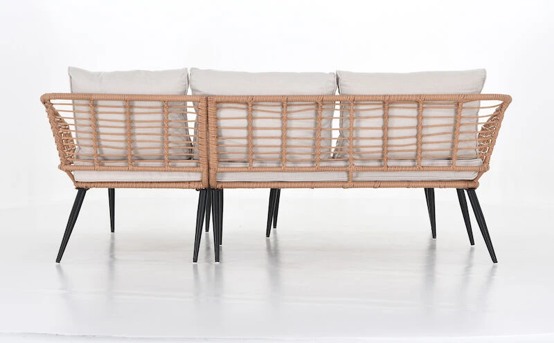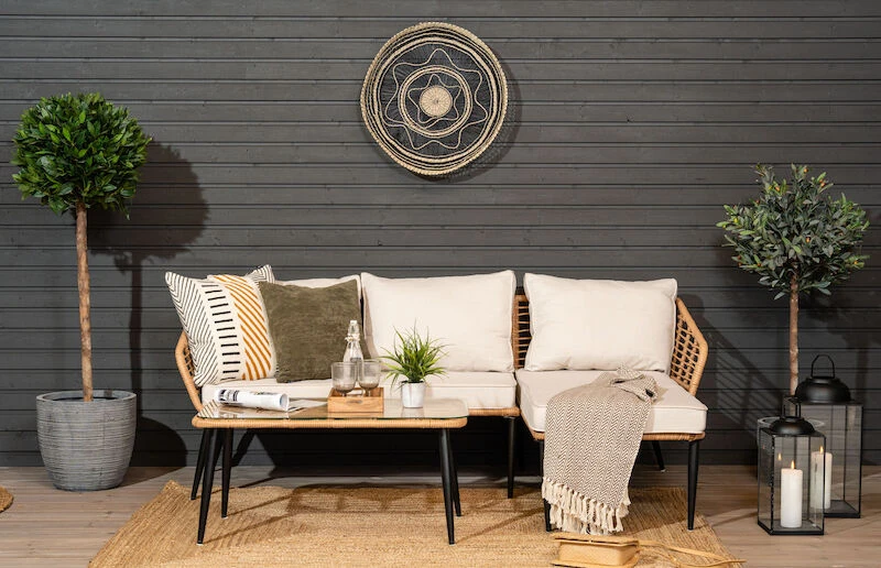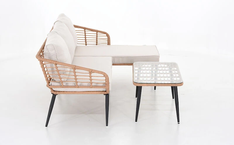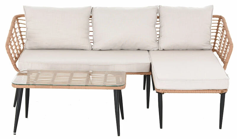 Scandic divaanisohvassa ja sohvapöydässä on tyylikäs mustaksi pulverimaalattu metallinen runko, jota kehystää kaunis ja kestävä sekä helppohoitoinen polyrottinki. Sohvapöydässä on karkaistu lasikansi. Divaanisohva sopii täydellisesti kesäpäiviin terassille, kun haluat viettää aikaa rennosti auringossa nauttien. Mukana tulee istuin- ja selkäpehmusteet, joiden värimaailma itse rungon kanssa sointuu kauniisti yhteen. Pehmusteiden kangas on vettähylkivää, mutta tyynyt on suositeltavaa siirtää aina sateensuojaan. Pöydän jalkojen väliin jää 75 cm pidemmällä sivulla ja lyhyemmällä 35 cm. Kansi on 3 cm paksu.
