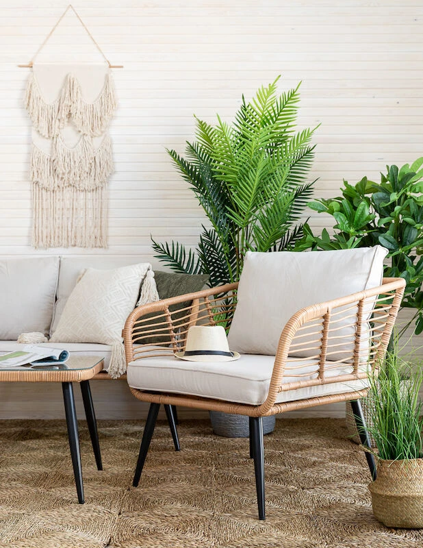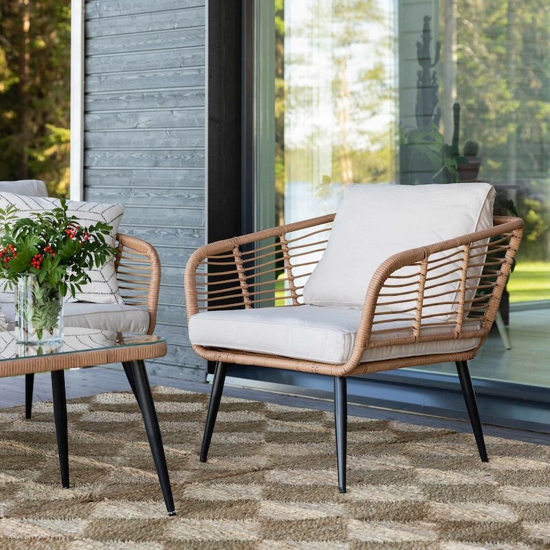 Scandic nojatuoli on moderni ja skandinaavinen polyrottinkinen nojatuoli ulos. Kesäinen nojatuoli muhkealla pehmusteella takaa rennot kesäpäivät. Materiaali nojatuolissa on UV-suojattua polyrottinkia ja runko on mustaksi maalattua metallia. Polyrottinki on kestävä ja helppohoitoinen materiaali terassille ja parvekkeelle.