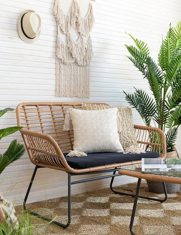 Kepeän kesäinen sohvaryhmä joka koostuu sohvasta, kahdesta tuolista ja lasipintaisesta pöydästä. Materiaali on UV-suojattua polyrottinkia, tukeva runko mustaksi maalattua metallia. Polyester-kankaalla verhoillut pehmusteet sisältyvät toimitukseen.