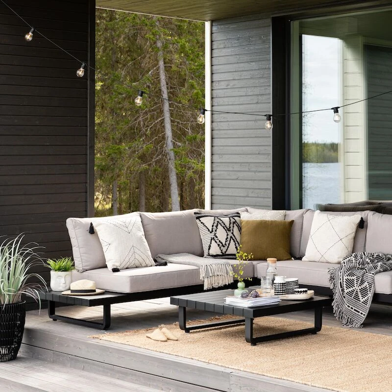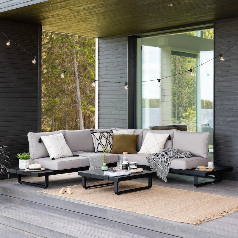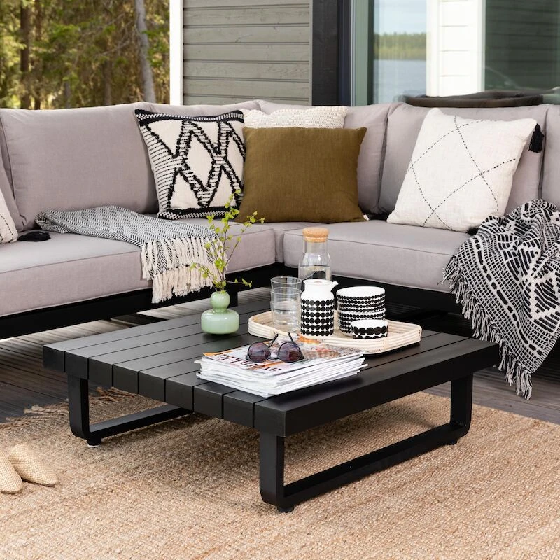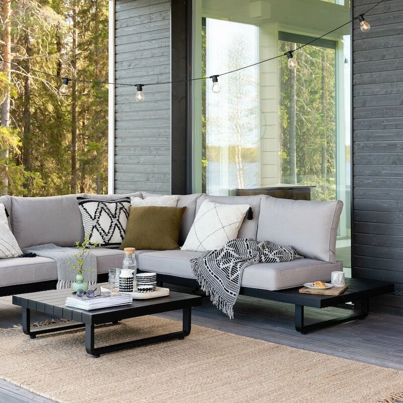 Tähän tilavaan Suvanto kulmasohvaan sopii surempikin porukka kerrallaan istumaan. Mukaan kuuluu sohvapöytä. Runko alumiinia, joka on mustaksi jauhemaalattu. Puiset osat ovat akaasia. Muhkeat istuinpehmusteet ovat hiekanväriset ja tyynyt on UV-suojattu.Tyynyjä voi käyttää kaksipuoleisesti ja päälliset ovat irrotettavissa ja pestävissä. Istuinleveys sohvalla on 136/209 cm. Tuote myydään lievänä 2-laatuisena pintakäsittely virheiden vuoksi!