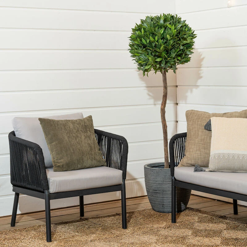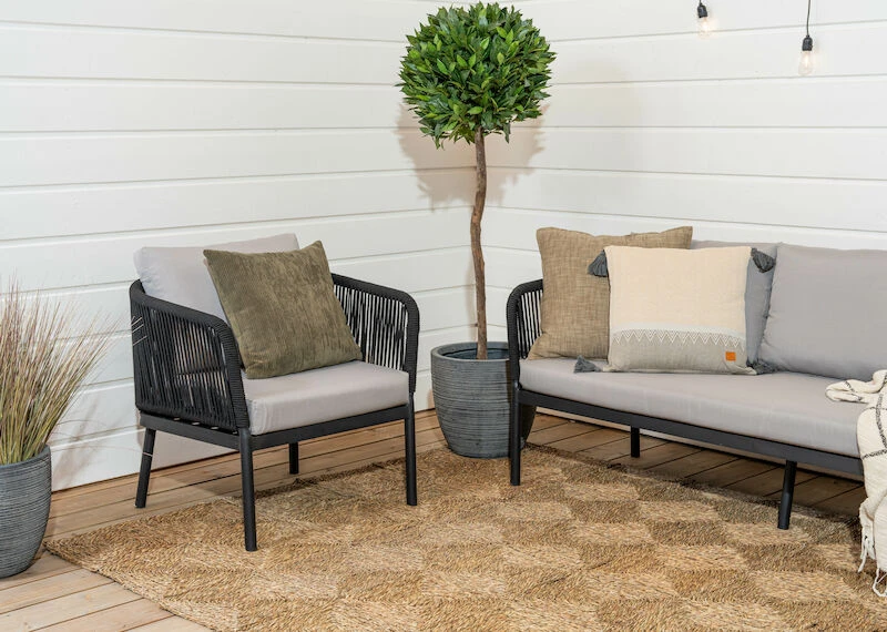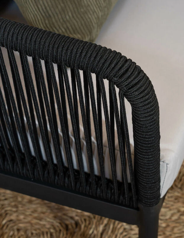 Tuohi nojatuoli pihalle, parvekkeelle tai patiolle. Tuohi nojatuolin siro ja ilmava muotoilu tuovat ulkotilohin nykyajan linjakkuutta. Runkomateriaalina laadukas ja täysin ruostumaton alumiinirunko, joka on maalattu mustaksi. Käsi- ja selkänojat ovat uudenaikaista helppohoitoista nailon punosta, joka on mattaisempi ja luonnollisemman näköinen kuin perinteinen polyrottinki. Pehmusteet on verhoiltu vettähylkivällä kankaalla, joka ei kuitenkaan ole täysin vedenpitävä. Pehmusteet tulee säilyttää sateelta suojassa. Kuvissa näkyvä Tuohi 3-istuttava sohva on erikseen ostettavissa.